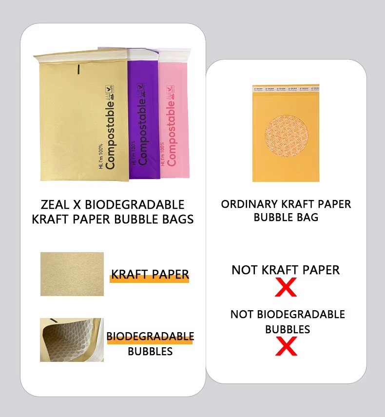 একজন পেশাদার পেপার ব্যাগ প্রস্তুতকারক হিসাবে, Zeal X কাস্টম আকার, লোগো প্রিন্টিং এবং কাগজের ওজনের বিকল্পগুলি সহ সম্পূর্ণরূপে কাস্টমাইজযোগ্য বায়োডিগ্রেডেবল ক্রাফ্ট পেপার বাবল মেইলার অফার করে। এই কম্পোস্টেবল মেইলারগুলি 100% বায়োডিগ্রেডেবল, অ-বিষাক্ত এবং দূষণ-মুক্ত, টেকসই প্যাকেজিং কৌশলগুলির জন্য তাদের আদর্শ করে তোলে। শক্তিশালী টিয়ার রেজিস্ট্যান্স, লাইটওয়েট ডিজাইন এবং এক্সপ্রেস ডেলিভারির জন্য নির্ভরযোগ্য সুরক্ষা সহ, আমাদের ক্রাফ্ট পেপার বাবল মেইলারগুলি বিশ্বব্যাপী ইকমার্স বিক্রেতাদের দ্বারা বিশ্বস্ত হয় যারা পরিবেশ বান্ধব, প্লাস্টিক-মুক্ত শিপিং সমাধান খুঁজছেন।