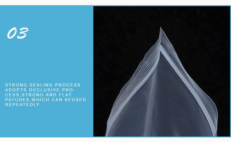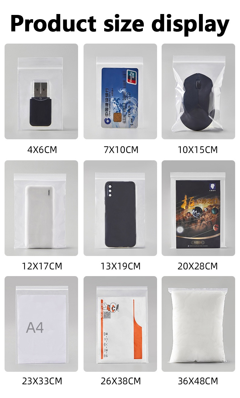 অ্যাপ্লিকেশন: রিসেলযোগ্য জিপলক ব্যাগ বিভিন্ন মাপের বিভিন্ন ক্ষেত্রের জন্য উপযুক্ত, যেমন স্টোরেজ, পোশাক, জুতা, গয়না, চিকিৎসা, হার্ডওয়্যার আনুষাঙ্গিক ইত্যাদি।
